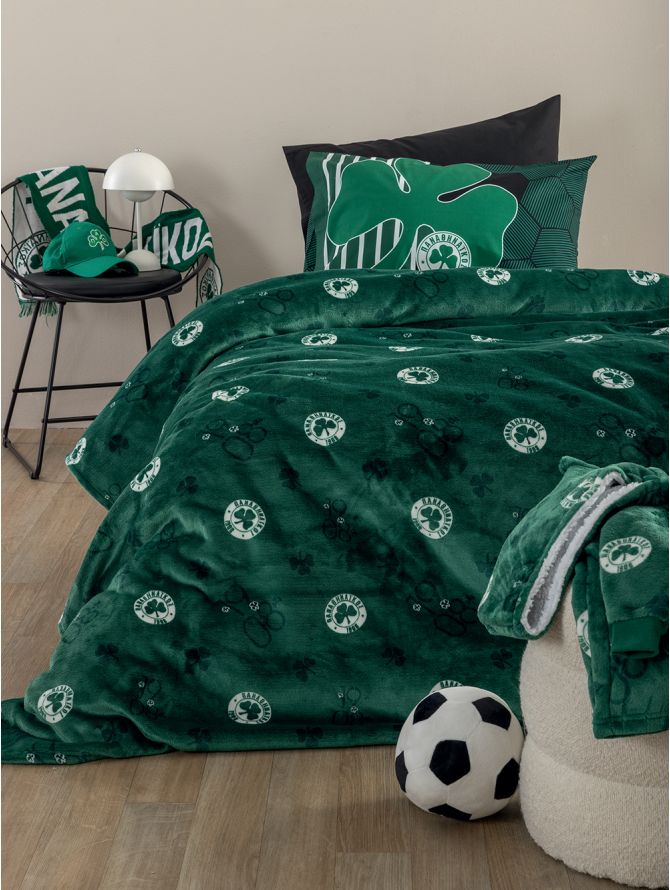 Κουβέρτα Ημίδιπλη 160×220 PANATHINAIKOS BL διπλής όψης, από ύφασμα 100% flannel στη μία πλευρά, γούνα sherpa στην άλλη, αφράτη, μαλακή, ζεστή, ιδανική για το χειμώνα.